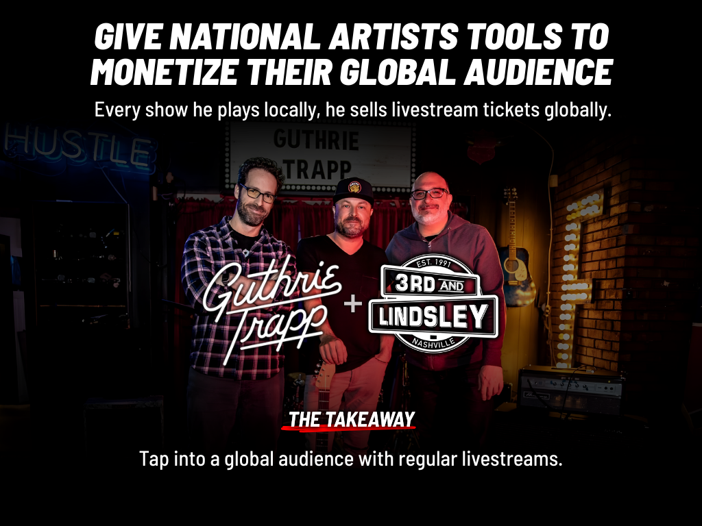 Artists like Guthrie Trapp lean on Volume.com to livestream local shows to his global audience, solving the problem of fans who can’t attend without asking the artists to do more work.